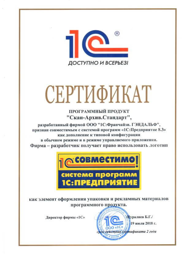 Благодаря этому «Скан-Архив» получил сертификат совместимости с программами «1С». Такая сертификация нужна, чтобы пользователи получали программы по автоматизации предприятия без дополнительных сложностей. Встраивание сертифицированных программ в конфигурации «1С» не приведет к нарушению их работы.